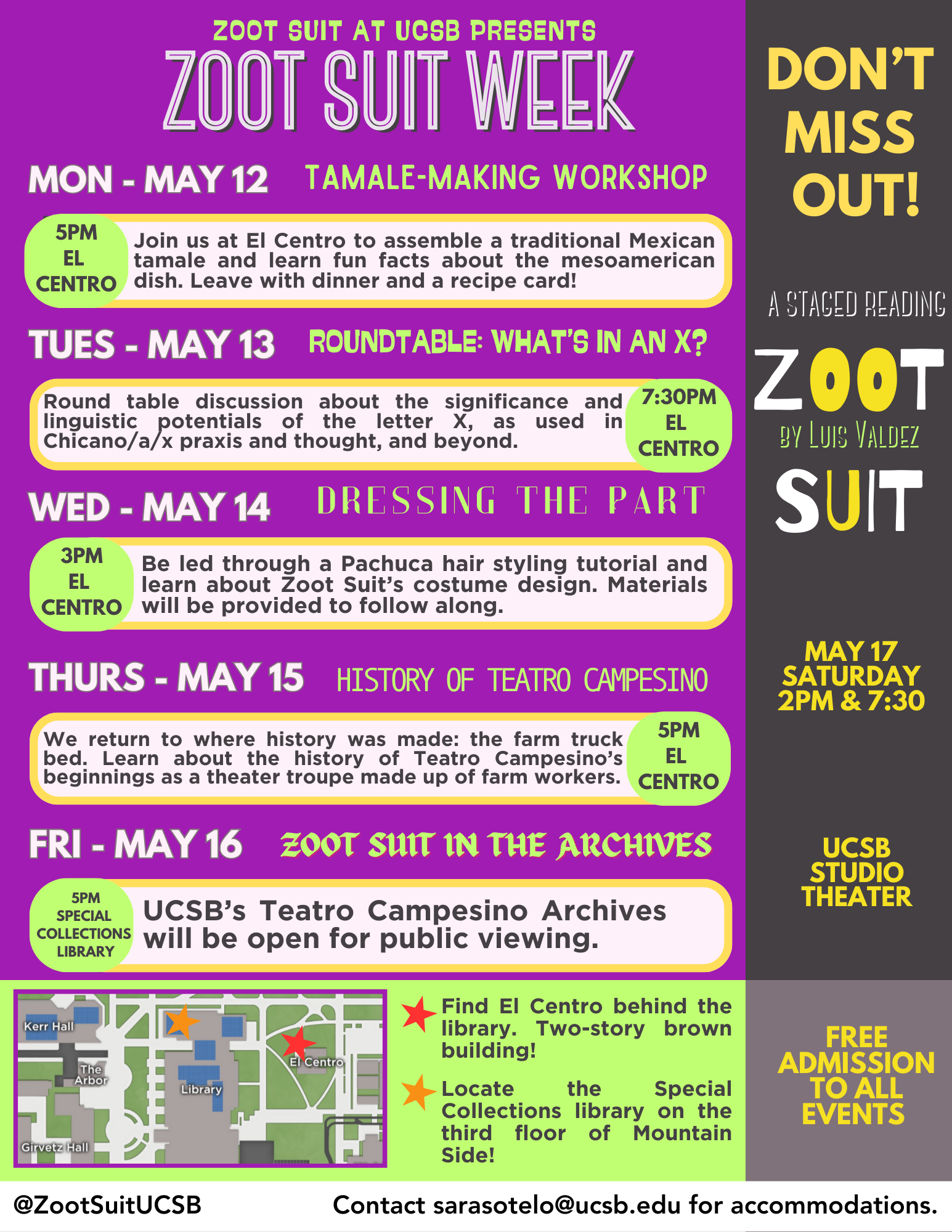 Production manager Gomez-Labrada stated on behalf of the organization, “We host series like these to engage with theater and Latino/a/x work in new ways.” The student organization hosted a series of programming events that brought forth the play’s dramaturgical elements to its audience members. Below is a poster of the organization’s series of events, which interacted with Rasquache, Pachucho/a/x, and Latino/a/x aesthetics in various capacities.